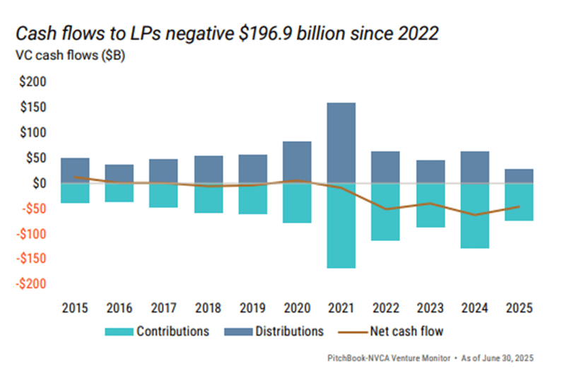 Despite the uptick, distributions were unable to offset the years of negative cash flow to LPs. Fundraising reflected this tension: 2025 saw the fewest funds closed in a decade, with capital consolidating among large, established managers and dry powder aging across vintages. Venture secondaries quietly emerged as a critical release valve, approaching parity with IPOs and acquisitions in exit value and becoming an increasingly institutionalized part of the ecosystem.