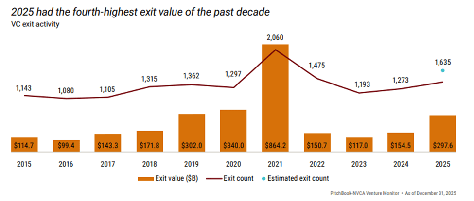 On the exit side of things, activity has been improving but trailed the high hopes that many had for the year. It was the second-most-active year by exit count and the fourth by exit value (after 2019, 2020, and 2021), generating $297.6 billion across an estimated 1,635 exits.